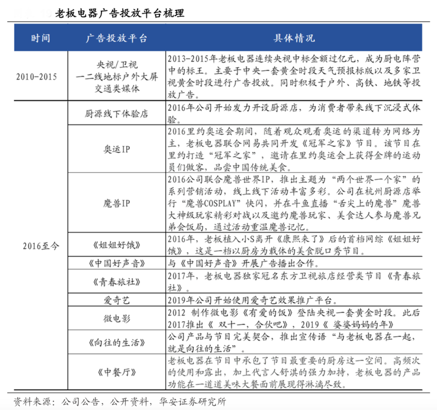 經(jīng)典案例:根據(jù)公司公告、公開資料和華安證券研究所等綜合資訊表明,2015 年之前,老板電器公司廣告多投放在央視等權(quán)威媒體平臺(tái),既契合公司產(chǎn)品的高端定位,又能借助黃金時(shí)段大量覆蓋消費(fèi)者, 達(dá)到“廣而告之”的效果。這一階段的大力投入,使得公司品牌家喻戶曉,高端形象深入人心。2015年后其開始與大 IP、網(wǎng)絡(luò)平臺(tái)和知名綜藝合作,大大擴(kuò)大了品牌知名度,提升了品牌影響力。
