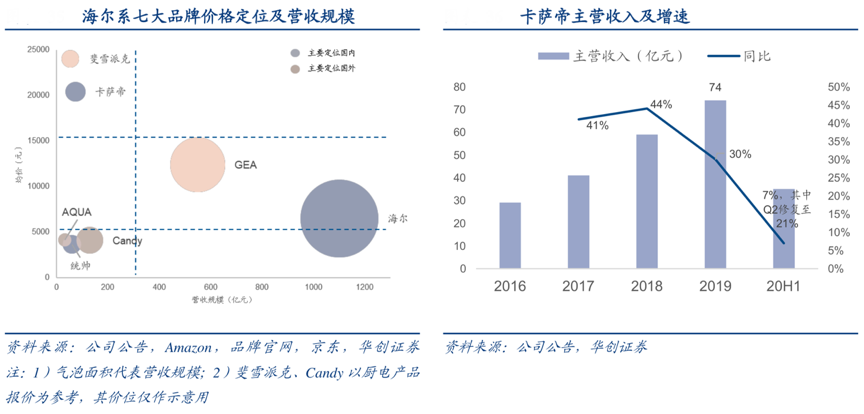 經(jīng)典案例:根據(jù)公司公告、Amazon、品牌官網(wǎng)、京東、華創(chuàng)證券等綜合資訊表明,結(jié)合公司公告、華創(chuàng)證券等綜合資訊,卡薩帝品牌近年保持高增趨勢(shì)。在過(guò)去2017-2019年間卡薩帝營(yíng)收增速分為41%、44%和30%,即使疫情影響下20H1在全國(guó)各家電品牌大幅下滑的背景下,卡薩帝依然保持 7%的增速。