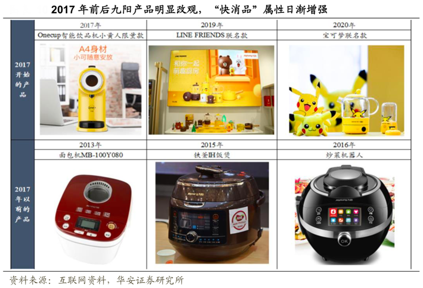 經(jīng)典案例:根據(jù)互聯(lián)網(wǎng)資料、華安證券研究所等綜合資訊表明,2018-2019 年,抖音、快手等內(nèi)容平臺帶動直播電商興起,電商娛樂化,小家電低單價、高顏值、新奇有趣的特性與直播帶貨場景契合,掀起一波爆款風(fēng)潮,代表產(chǎn)品有九陽 Line Friends 聯(lián)名款、小熊創(chuàng)意小家電等,沖動消費在小家電領(lǐng)域占比進(jìn)一步提升,此類品牌是小家電,具有家電產(chǎn)業(yè)的“共同特性”,同時擁有創(chuàng)意、時尚的特質(zhì),具有“產(chǎn)業(yè)獨特性”。