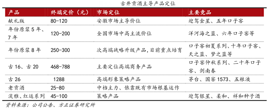 經(jīng)典案例:根據(jù)公司公告、方正證券研究所等綜合資訊表明,古井貢酒強(qiáng)品牌主導(dǎo)各產(chǎn)品定位有所不同,年份原漿自2008年推出后,即取得了超常規(guī)的成長業(yè)績,在銷售結(jié)構(gòu)中占比不斷提高,帶動利潤大幅增長。截止2019年底,其“年份原漿”系列營收占比達(dá) 85%左右,其中古 8 及以上占比超過25%。