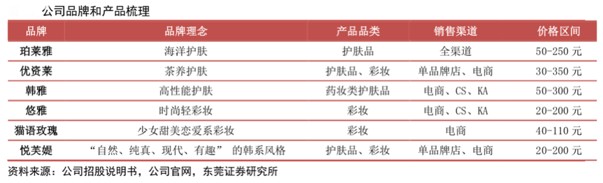 經(jīng)典案例:根據(jù)公司招股說明書、公司官網(wǎng)、東莞證券研究所等綜合資訊表明,珀萊雅旗下?lián)碛?ldquo;珀萊雅”、“優(yōu)資萊”、“韓雅”、“悠雅”、“貓語玫瑰”“悅芙媞”等多個品牌,產(chǎn)品覆蓋護膚品、彩妝、清潔洗護、香薰等化妝品多個領(lǐng)域,構(gòu)建了覆蓋日化專營店、百貨商場、超市和電子商務(wù)的多渠道銷售網(wǎng)絡(luò)。據(jù)歐睿國際數(shù)據(jù)顯示,2019 年公司占國內(nèi)護膚品市場的1.4%,在國產(chǎn)品牌里排名第6。