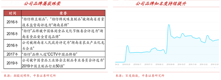 經(jīng)典案例:根據(jù)招股說明書、中泰證券研究所等綜合資訊表明,華文食品屢獲殊榮,主品牌“勁仔”先后被評為“湖南名牌”,并入選“CCTV 中國品牌榜”等。 從百度搜索指數(shù)、中泰證券研究所等綜合資訊同樣可以看到,近兩年“勁仔”關(guān)注度明顯提升,逐漸占據(jù)了消費者對于休閑小魚這一細分領(lǐng)域的認知,在華中乃至全國形成了一大批忠實消費者。