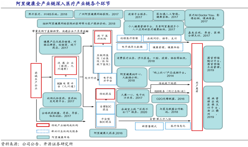經(jīng)典案例:根據(jù)公司公告、開源證券研究所等綜合資訊表明,阿里健康全產(chǎn)業(yè)鏈已經(jīng)深入到醫(yī)療產(chǎn)業(yè)鏈的各個一節(jié),其以廣州阿里健康網(wǎng)絡(luò)醫(yī)院等為醫(yī)療服務(wù)的線下落地點(diǎn),以熙牛醫(yī)療、醫(yī)療AI等為強(qiáng)技術(shù)支撐,自 2011 年起布局大健康產(chǎn)業(yè)。阿里巴巴“醫(yī)療健康服務(wù)生態(tài)”日臻完善。