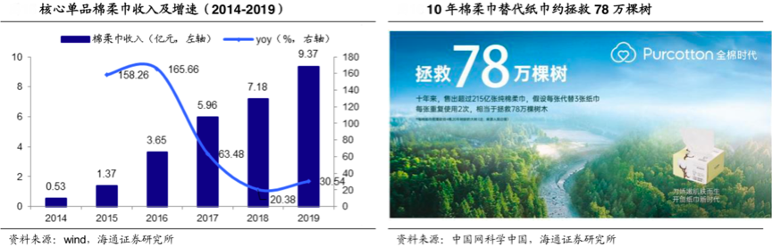 經(jīng)典案例:根據(jù)wind、海通證券研究所、中國網(wǎng)科學(xué)中國等綜合資訊表明,全棉時代革新性推出純棉柔巾,采用全棉材質(zhì),具有產(chǎn)品舒適、化學(xué)刺激少的功能特性,很適合給寶寶使用,同時2019 年公司核心單品棉柔巾收入9.37 億元增 30.54%,2014-2019 年 CAGR 為 77.51%。