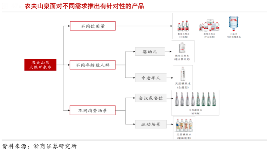 經(jīng)典案例:根據(jù)浙商證券研究所等綜合資訊表明,農(nóng)夫山泉面對不同需求推出有針對性的產(chǎn)品,以包裝水為例,針對不同飲用量需求,農(nóng)夫山泉推出了380ml-12L 的各規(guī)格飲用水;針對不同年齡段,推出面向嬰幼兒的飲用天然水、面向中老年人補(bǔ)充與神經(jīng)系 統(tǒng)相關(guān)鋰元素的天然礦泉水(含鋰型);針對不同消費(fèi)場景,推出了定位為會議或宴飲飲用的高端產(chǎn)品天然礦泉水(玻璃瓶),以及面向運(yùn)動場景所設(shè)計(jì)的可單手開瓶蓋的天然礦泉水(運(yùn)動瓶蓋)。產(chǎn)品的多場景銷售,驅(qū)動著公司產(chǎn)業(yè)品牌的快速變現(xiàn)。