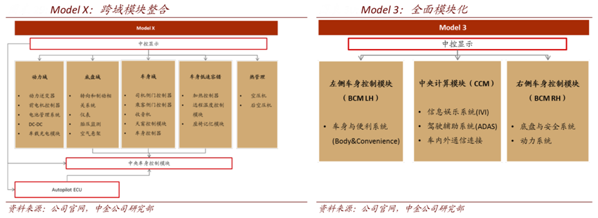經(jīng)典案例:根據(jù)公司官網(wǎng)、中金公司研究部等綜合資訊表明,特斯拉以軟件定義汽車(chē),突破性模塊整合。Model X通過(guò)中 央車(chē)身控制系統(tǒng)對(duì)動(dòng)力域、底盤(pán)域、車(chē)身域等進(jìn)行跨域模塊整合,Model 3 則全面模塊化,分為左側(cè)車(chē)身控制模塊、中央計(jì)算模塊和右側(cè)車(chē)身控制模塊,更加有效地節(jié)省算力冗余,也更便于 OTA 升級(jí)。