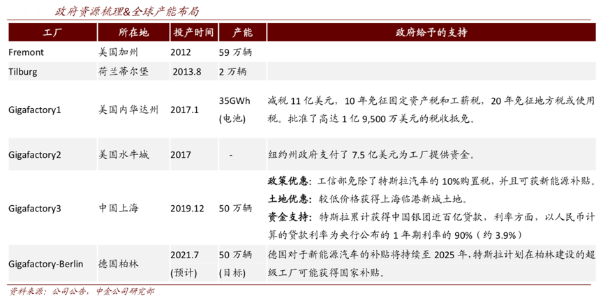 經(jīng)典案例:根據(jù)公司公告、中金公司研究部等綜合資訊表明,特斯拉尋求當(dāng)?shù)刭Y源加杠桿,降低制造成本,其產(chǎn)能布局全球,在美國(guó)、中國(guó)上海、德國(guó) 柏林等多地建立工廠,節(jié)省運(yùn)輸成本,同時(shí)又可以享受到當(dāng)?shù)卣a(bǔ)貼,極大的匯聚了產(chǎn)業(yè)資源。