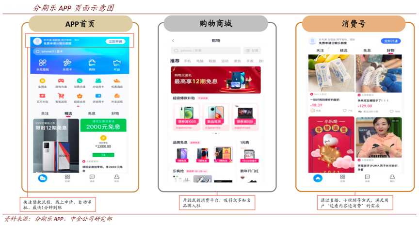經(jīng)典案例:根據(jù)分期樂APP、中金公司研究部等綜合資訊表明,分期樂商城利用人工智能及大數(shù)據(jù)風(fēng)控技術(shù),提供個人消費(fèi)信貸及場景分期服務(wù),具有申請簡便、審批快、額度高,到賬快等特點(diǎn)。2020 年,分期樂商城推出了更加開放的全新版本,促進(jìn)優(yōu)質(zhì)商家與優(yōu)質(zhì)內(nèi)容結(jié)合,實(shí)現(xiàn)了“屏幕即店鋪,內(nèi)容即商品”,提高商品與用戶匹配效率。2020 年雙 11 大促開始僅 46 秒,分期樂商城下單金額已經(jīng)突破 1 億元。