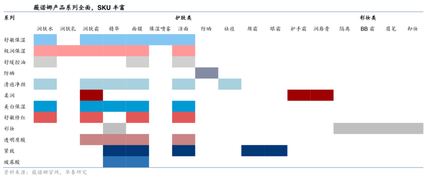 經(jīng)典案例:根據(jù)薇諾娜官網(wǎng)、華泰研究等綜合資訊表明,2005年6月貝泰妮聯(lián)合昆明醫(yī)科大學(xué)第一附屬醫(yī)院皮膚科、中國(guó)科學(xué)院昆明植物研究所,通過(guò)醫(yī)、產(chǎn)、學(xué)、研結(jié)合, 從云南6000多種植物中,選出青刺果、馬齒莧、滇重樓、滇山茶作為產(chǎn)品的四大核心成分,并進(jìn)行12000次以上的肌膚實(shí)測(cè)驗(yàn)證,2008 年薇諾娜首次于第四屆中國(guó)皮膚科醫(yī)師年會(huì)上亮相?;谑婷羲幚砝砟?, 旗下產(chǎn)品涵蓋舒敏保濕、舒緩控油、透白、極潤(rùn)、緊致,防曬等 12 個(gè)系列,69 種單品。