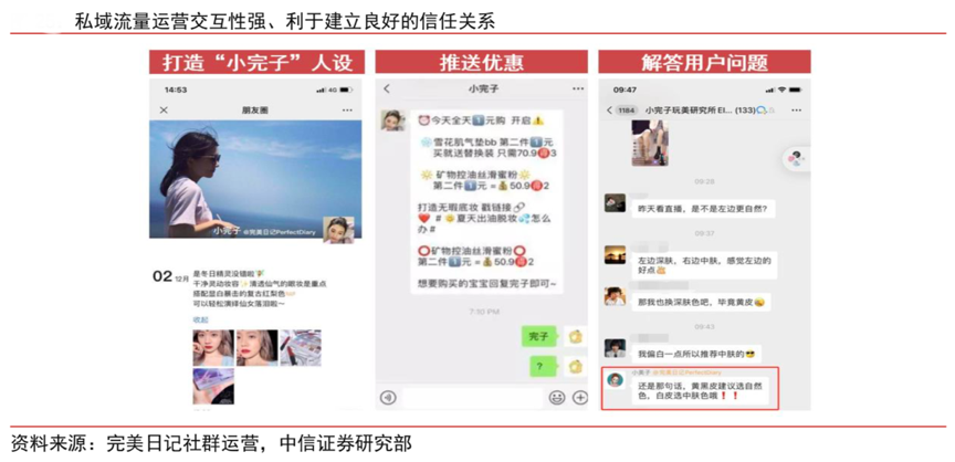 經(jīng)典案例:根據(jù)完美日記社群運(yùn)營(yíng)、中信證券研究部等綜合資訊表明,完美日記通過打造導(dǎo)購“小完子”的精致少女人設(shè),不定期向用戶推送商品優(yōu)惠、解答用戶問題,有效拉近了與用戶的距離。同時(shí)品牌能夠通過微信群、個(gè)人微信等載體,實(shí)現(xiàn)與用戶的雙向溝通,通過發(fā)布用戶調(diào)研等方式洞察消費(fèi)者的真實(shí)需求。