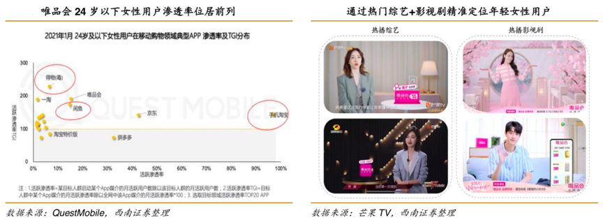 經(jīng)典案例:根據(jù)QuestMobile、芒果TV和西南證券等綜合資訊表明,唯品會(huì)憑借服飾美妝品類(lèi)的優(yōu)勢(shì),24 歲以下的年輕女性用戶在唯品會(huì)內(nèi)的滲透率 TGI 位居移動(dòng)購(gòu)物領(lǐng)域的第二名,年輕女性用戶持續(xù)增加的趨勢(shì)或進(jìn)一步提升唯品會(huì)的平臺(tái)價(jià)值。根據(jù) QuestMobile 的數(shù)據(jù),2021 年 1 月唯品會(huì) 24 歲及以下女性用戶的活躍滲透率 TGI 僅低于得物,位居行業(yè) TOP2。根據(jù)公司 20Q3 業(yè)績(jī)會(huì)信息,公司新客中的 60%來(lái)自于 90 后和 00 后。 同時(shí),2019 上半年,90 后在唯品會(huì)大牌折扣頻道的訂單占比已接近 1/3。