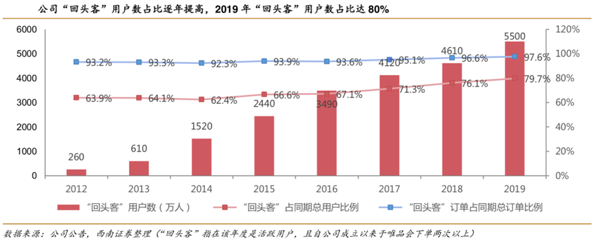 經(jīng)典案例:根據(jù)公司公告、公司小程序和西南證券等綜合資訊表明,唯品會2019 年“回頭客”訂單占總訂單的97.6%,其用戶粘性強、留存率高。2017 年、2018 年、2019 年度唯品會“回頭客”即曾經(jīng)購買過并在該年度仍然通過唯品會購買過產(chǎn)品的客戶分別達(dá)到了 4120 萬、4610 萬和 5500 萬,分別占同期活躍客戶總數(shù)的71.3%、76.1%和79.7%。“回頭客”訂單分別占同期總訂單的 95.1%、96.6%和97.6%。