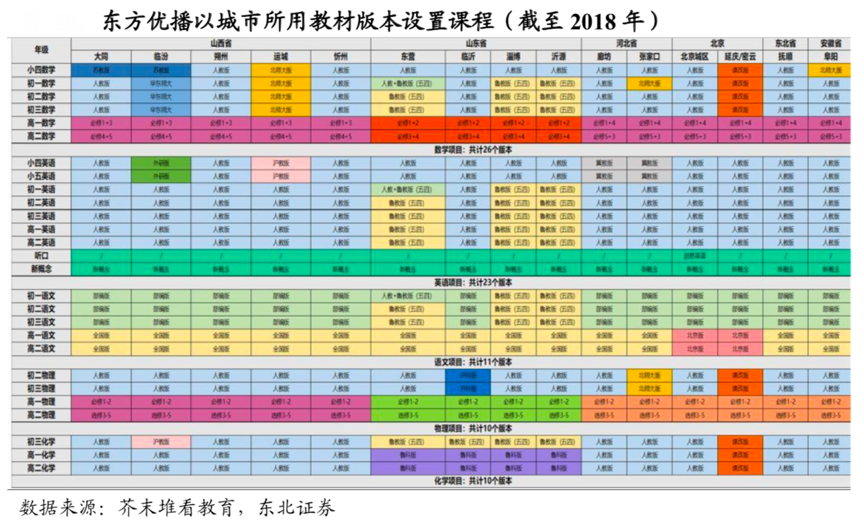 經(jīng)典案例:根據(jù)芥末堆看教育、東北證券等綜合資訊表明,東方優(yōu)播的課程設(shè)置是以城市為單位的獨立課程,緊貼本地教材內(nèi)容,教研團隊會在考慮當(dāng)?shù)亟滩那闆r和學(xué)生接受能力的基礎(chǔ)上,對不同地域設(shè)置差異化的課程。東方優(yōu)播 2018年根據(jù)不同學(xué)科對進駐城市所使用的教材進行了研究,出臺個性化的教學(xué)方案。在學(xué)生選課時,東方優(yōu)播也會根據(jù)學(xué)生所在地進行班級劃分。