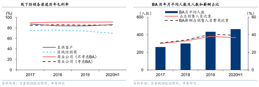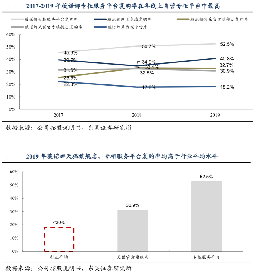 經(jīng)典案例:根據(jù)貝泰妮招股說明書、華泰研究等綜合資訊表明,2019年薇諾娜線下選擇部分網(wǎng)點派駐BA,實現(xiàn)線下向線上的引流,其微信平臺的收入規(guī)模也實現(xiàn)快速增長,2019 年微信平臺的客戶復(fù)購率高達(dá) 52.52%,居各渠道首位。其根據(jù)商業(yè)公司渠道與薇諾娜專柜服務(wù)平臺的銷售收入比例對 BA 費用分?jǐn)偅o予商業(yè)公司供貨價格及毛利率高于其他渠道。