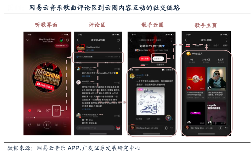 經(jīng)典案例:根據(jù)網(wǎng)易云音樂APP、廣發(fā)證券發(fā)展研究中心等綜合資訊表明,云村和云圈為音樂創(chuàng)作者和音樂愛好者提供了交流互動空間和興趣小組,其從產(chǎn)品端打通了從用戶聽歌、評論互動,再轉(zhuǎn)化到歌手云圈、云村的一整條內(nèi)容創(chuàng)作到用戶反饋和關(guān)系沉淀的鏈路。