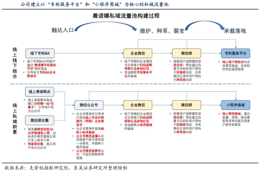 經(jīng)典案例:根據(jù)克勞銳指數(shù)研究院、東吳證券研究所等綜合資訊表明,薇諾娜在完成消費者的初步觸達(dá)之后,其可通過 BA 的企業(yè)微信、微信群、視頻號、直 播入口等方式進(jìn)行客戶的維護(hù)、種草和裂變。具體來看,線下專柜的消費者和線上消費者在完成關(guān)注或購買后,分別通過被引導(dǎo)加入線下和線上的 BA 企業(yè)微信號。在此基礎(chǔ)上,BA 通過其企業(yè)微信號向消費者推送微信群二維碼,以福利或紅包的形式吸引消費者加入分層精準(zhǔn)運營的微信群,以此實現(xiàn)公域流量向私域流量的轉(zhuǎn)化,并完成客戶的維護(hù)、促進(jìn)客戶復(fù)購。