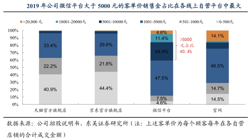 經(jīng)典案例:根據(jù)公司招股說明書、東吳證券研究所等綜合資訊表明,薇諾娜在其各自營電商渠道中,微信平臺消費的客單價最高,2019 年微信平臺客單價大于 1000 元/大于 5000 元的銷售金額占比達(dá)到 87.9%/40.4%。專柜服務(wù)平臺客戶主要集中于 0-10000 元的客單價區(qū)間,主要系客戶具有線下實體店使用經(jīng)驗,對產(chǎn)品屬性較為熟悉,傾向于組合購買,且經(jīng)過 BA 的推廣和維護(hù)復(fù)購率較高。