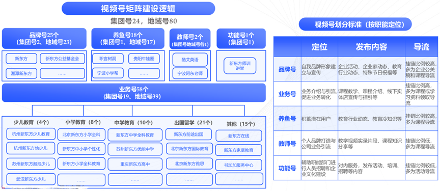 經(jīng)典案例:根據(jù)《20210426-新榜研究院-教育行業(yè)視頻號矩陣建設(shè)與運(yùn)營策略分析報告》等綜合資訊表明,新東方總部開設(shè)24個集團(tuán)視頻號,各地分公司共開設(shè)80個針對各區(qū)域品牌和業(yè)務(wù)的視頻號;針對少兒、小學(xué)、中學(xué)、出國留學(xué)等不同的教育階段,新東方均分別開設(shè)不同的視頻號,并按照賬號職能劃分為品牌、業(yè)務(wù)、養(yǎng)魚、功能及教師號等。