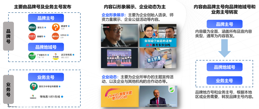 經(jīng)典案例:根據(jù)《20210426-新榜研究院-教育行業(yè)視頻號矩陣建設(shè)與運(yùn)營策略分析報告》等綜合資訊表明,教育企業(yè)品宣內(nèi)容通常由品牌主號、品牌地域號、業(yè)務(wù)主號進(jìn)行發(fā)布。由品牌主號發(fā)布原創(chuàng)內(nèi)容,品牌地域號和業(yè)務(wù)主號根據(jù)需要進(jìn)行內(nèi)容轉(zhuǎn)發(fā)。其品宣內(nèi)容主要為企業(yè)形象展示、企業(yè)動態(tài)兩大類型。企業(yè)形象展示注重宣傳企業(yè)價值觀、企業(yè)實(shí)力,價值觀宣傳主要包括創(chuàng)始人語錄、企業(yè)參加公益活動等,企業(yè)實(shí)力主要通過展示師資力量方式呈現(xiàn)。企業(yè)動態(tài)包括企業(yè)所舉辦的主題活動、以及企業(yè)與其他機(jī)構(gòu)達(dá)成的合作等信息內(nèi)容。