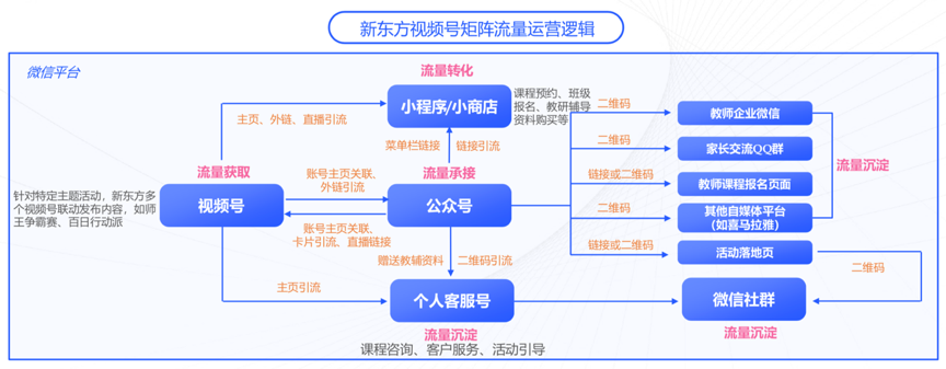 經(jīng)典案例:根據(jù)《20210426新榜研究院-教育行業(yè)視頻號(hào)矩陣建設(shè)與運(yùn)營(yíng)策略分析報(bào)告》等綜合資訊表明,視頻號(hào)矩陣為新東方提供新的流量獲取入口,通過視頻號(hào)的主頁、外鏈以及直播等形式,其將獲取的流量導(dǎo)至自有的公眾號(hào)、小程序或者客服號(hào),繼而形成銷售轉(zhuǎn)化; 其中,公眾號(hào)是最主要的流量承接中轉(zhuǎn)站,主要通過菜單欄植入、發(fā)文鏈接、海報(bào)二維碼的形式將流量引導(dǎo)至社群、小程序或者新東方在其他自媒體平臺(tái)開設(shè)的賬號(hào)。