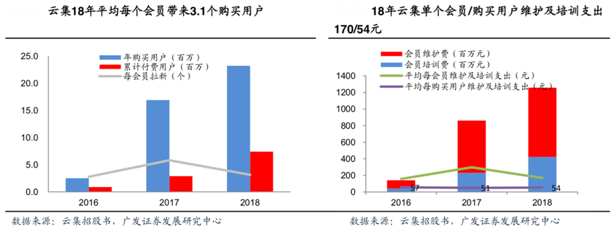 經(jīng)典案例:根據(jù)云集招股書(shū)、廣發(fā)證券發(fā)展研究中心等綜合資訊表明,2018年云集支付會(huì)員培訓(xùn)費(fèi)及會(huì)員維護(hù)費(fèi)用合計(jì)12.6億元,假設(shè)全部支付給客戶(hù)&服務(wù)經(jīng)理,則平均單個(gè)客戶(hù)&服務(wù)經(jīng)理年收入約1.8萬(wàn)元。將云集會(huì)員維系支出視作平臺(tái)引流成本,平攤至所有會(huì)員,則對(duì)應(yīng)18年云集平均每個(gè)會(huì)員維護(hù)及培訓(xùn)支出約170元;若進(jìn)一步平攤至購(gòu)買(mǎi)用戶(hù)(即一般電商公司定義的用 戶(hù)規(guī)模),則對(duì)應(yīng)18年云集單個(gè)購(gòu)買(mǎi)用戶(hù)支付僅為54元,對(duì)比電商同行,無(wú)疑是低成本的引流獲客方式。