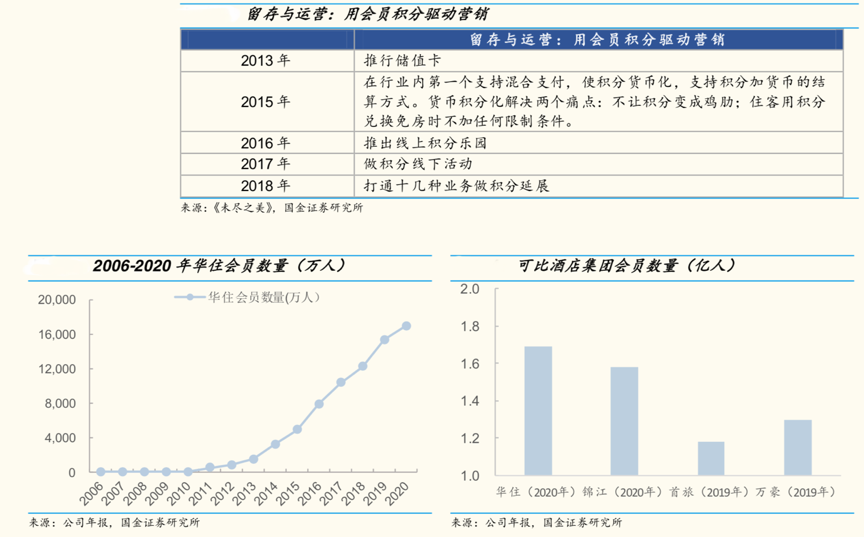 經(jīng)典案例:根據(jù)《未盡之美》、公司年報、國金證券研究所等綜合資訊表明,華住公司通過積分驅(qū)動營銷,線上積分線下活動等,加強與會員的互動,增加會員留存。其于2015年在行業(yè)內(nèi)第一個支持混合支付,支持積分加貨幣的結(jié)算方式,同時在住客使用積分兌換免費房時不加任何限制,解決一直以來會員積分實際兌換價值低,對會員而言體驗感差的痛點。截至 2020 年年報,華住已擁有1.69億會員。