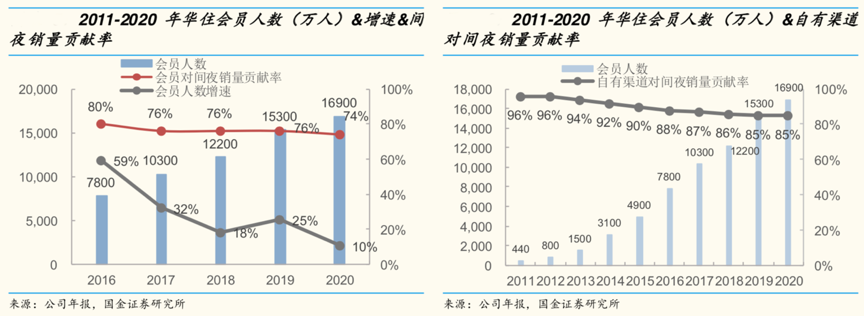 經(jīng)典案例:根據(jù)公司年報、國金證券研究所等綜合資訊表明,華住與打車軟件、 地圖軟件等系列應(yīng)用建立合作關(guān)系,這些合作以交易為導向,比如滴滴打車的積分換取華住的住宿,跨界吸引潛在客戶轉(zhuǎn)化為會員。目前,其B 端用戶的流量已經(jīng)能占到相當比例。2019 年,華住為國內(nèi)擁有最大會員計劃的酒店,會員貢獻約74%的間夜量。