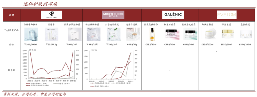 經(jīng)典案例:根據(jù)公司公告、中金公司研究部等綜合資訊表明,逸仙電商彩妝為基拓展衍生品類,滿足多元消費(fèi)需求。一方面,逸仙電商旗下主品牌“完美日記”以彩妝為基礎(chǔ),正逐步拓展安瓶、面膜等護(hù)膚類目;另一方面,通過(guò)子品牌“完子心選”的推出,進(jìn)一步完善在護(hù)膚領(lǐng)域的布局。2020 年 10 月逸仙電商收購(gòu)法國(guó) Pierre Fabre 集團(tuán)旗下高端藥妝護(hù)膚品牌 Galénic,2021 年 3 月宣布收購(gòu) Manzanita 旗下高端護(hù)膚品牌 Eve Lom,彰顯公司進(jìn)軍高端護(hù)膚的決心。