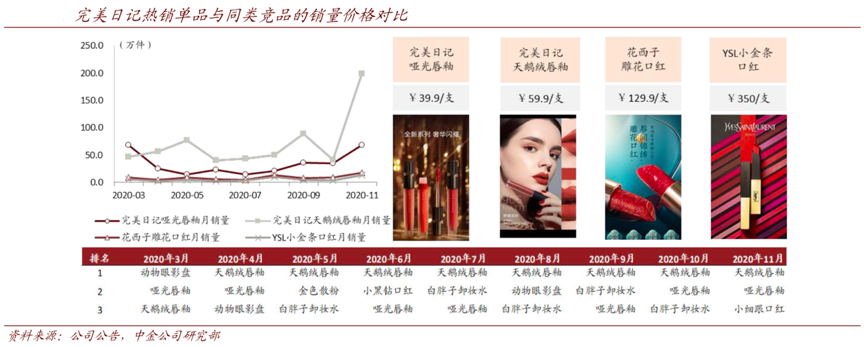 經(jīng)典案例:根據(jù)公司公告、中金公司研究部等綜合資訊表明,逸仙電商公司基于數(shù)據(jù)的產(chǎn)品開(kāi)發(fā)實(shí)現(xiàn)對(duì)用戶需求的精準(zhǔn)定位,提升爆款打造的確定性和可復(fù)制性。2019年,其有 20 件單品銷量超過(guò) 100 萬(wàn),多件產(chǎn)品年銷量在百萬(wàn)至千萬(wàn)件量級(jí),印證其爆款打造實(shí)力。與天貓上質(zhì)量相當(dāng)?shù)钠渌放仆悊纹?nbsp;109-630 元的價(jià)格區(qū)間相比,逸仙電商公司單品的價(jià)格區(qū)間僅為 49-129 元。