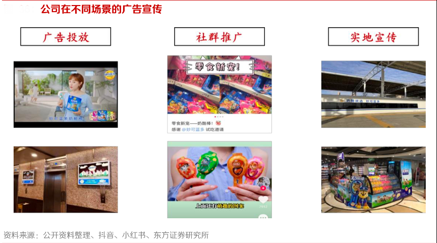 經典案例:根據公開資料整理、抖音、小紅書、東方證券研究所等綜合資訊表明,妙可藍多公司以“奶酪就選妙可藍多”作為品牌口號,進行全方位品牌建設。公司奶酪棒廣告片自 2018 年起陸續(xù)登陸多個央視及地方衛(wèi)視頻道、線下捆綁分眾電梯媒體,2020年公司簽約影視明星孫儷作為品牌代言人;公司在抖音、小紅書等社群中與達人合作,開展產品評鑒等內容營銷;此外,其還選擇列車、商超等地實地宣傳和展示奶酪產品。通過“廣告投放+社群推廣+實地宣傳”的營銷組合拳,妙可藍多奶酪的品牌形象已深入人心。