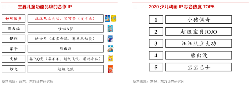 經(jīng)典案例:根據(jù)京東、雷報(bào)、東方證券研究所等綜合資訊表明,妙可藍(lán)多兒童奶酪產(chǎn)品自 2018 年起與知名少兒動(dòng)畫 IP“汪汪隊(duì)”深度合作,通過(guò)產(chǎn)品包 裝吸引目標(biāo)人群,百吉福、伊利等品牌則分別攜手哆啦 A 夢(mèng)、迪士尼等動(dòng)畫 IP。雷報(bào)統(tǒng)計(jì)顯示,綜合優(yōu)酷、愛(ài)奇藝、騰訊、芒果 TV 四大平臺(tái)數(shù)據(jù)來(lái)看,2020 年《汪汪隊(duì)立大功》在少兒動(dòng)畫 IP 熱度中排名第三,在眾多奶酪品牌聯(lián)合動(dòng)畫 IP 中脫穎而出。此外,2020年其與寶可夢(mèng)合作推出金裝奶酪棒,定位目標(biāo)人群父母進(jìn)行“家庭化”營(yíng)銷。