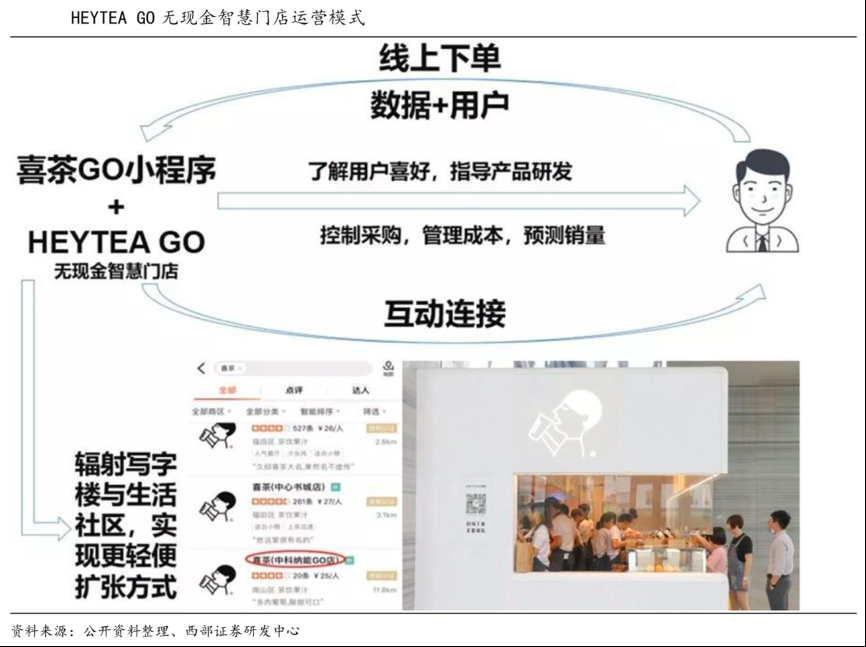 經(jīng)典案例:根據(jù)公開資料、西部證券研發(fā)中心等綜合資訊表明,喜茶公司推出“喜茶GO”小程序+HEYTEA GO無現(xiàn)金智慧門店,將服務(wù)與產(chǎn)品在線化,同時有效輻射寫字樓與生活社區(qū),實現(xiàn)更輕便擴(kuò)張方式。HEYTEA GO無現(xiàn)金智慧門店是區(qū)別于星巴克、樂樂茶等其他茶飲的主要特色。