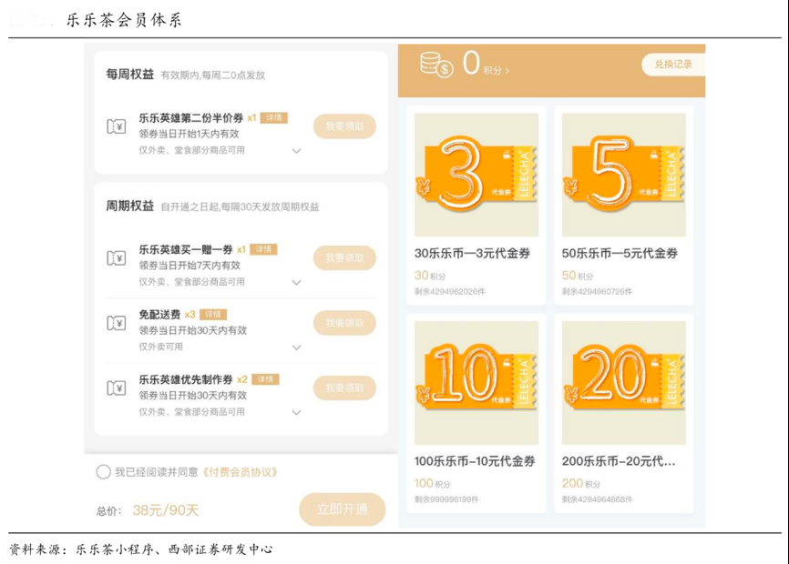 經(jīng)典案例:根據(jù)樂樂茶小程序、西部證券研發(fā)中心等綜合資訊表明,樂樂茶會員體系如下,一次性購買,不分會員等級,38 元/90 天,首次購買享樂樂英雄買一送一券 X1(開通 7 天內(nèi)),樂樂英雄優(yōu)先制作券 X2(開通 30 天內(nèi)),免費(fèi)配送 X3(開 通 30 天內(nèi));享受配送費(fèi) 7 折,雙倍積分,雙倍經(jīng)驗;積分和經(jīng)驗可用于抵優(yōu)惠券。