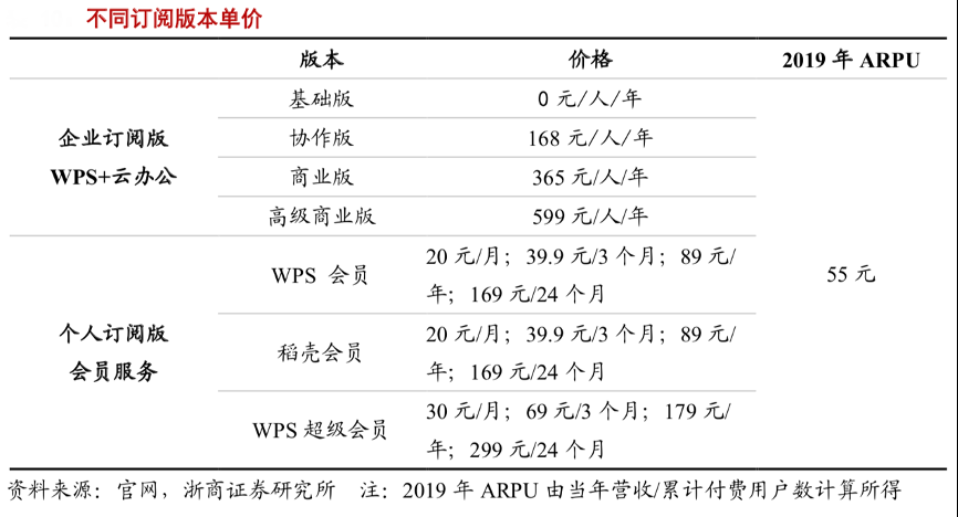 經(jīng)典案例:根據(jù)官網(wǎng)、浙商證券研究所等綜合資訊表明,由于銷售過程伴隨著優(yōu)惠、渠道分傭,根據(jù)當(dāng)年?duì)I收/累計(jì)付費(fèi)用戶數(shù)計(jì)算所得,目前金山辦公訂閱用戶會(huì)員客單價(jià)約為 55 元。隨著公客戶粘性的持續(xù)提升、話語權(quán)提高,以及新增功能模塊,中小企業(yè)市場云辦公的大力拓展,中長期機(jī)構(gòu)、個(gè)人訂閱客單價(jià)有望提升至 250 元/年和 130 元/年。