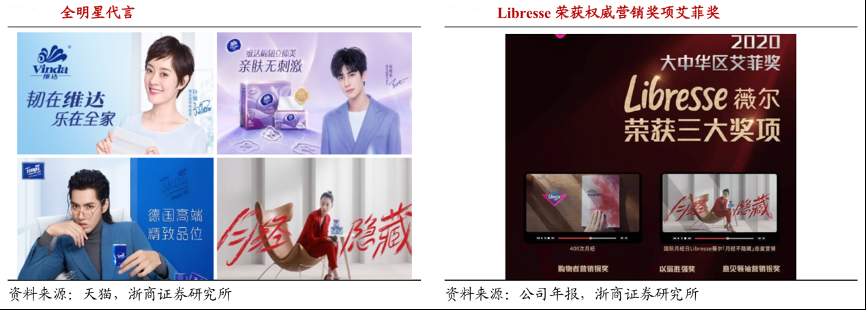 經(jīng)典案例:根據(jù)天貓、公司年報(bào)和浙商證券研究所等綜合資訊表明,維達(dá)公司是衛(wèi)生用品企業(yè)中唯一一家采用全明星代言戰(zhàn)略的公司,“維達(dá)”品牌擁有雙代言人“韌性媽媽”孫儷及年輕流量宋威龍,贏得主力消費(fèi)群體中年、青年女性群體的青睞;“得寶”、“Libresse”選用吳亦凡、周冬雨,迅速拓寬品牌與目標(biāo)消費(fèi)群的溝通渠道。2020 年,Libresse 推出“月經(jīng)不隱藏”活動(dòng),攜手代言人周冬雨鼓勵(lì)女性勇敢表達(dá)、打破束縛,引起消費(fèi)者共鳴。該活動(dòng)亦獲得業(yè)內(nèi)權(quán)威營(yíng)銷獎(jiǎng)項(xiàng)艾菲獎(jiǎng) 2020 年 KOL 營(yíng)銷銅獎(jiǎng)。