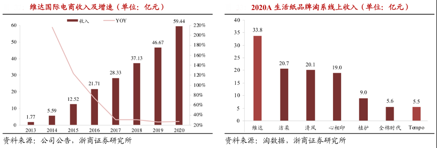 經(jīng)典案例:根據(jù)公司公告、淘數(shù)據(jù)、浙商證券研究所等綜合資訊表明,維達(dá)公司與京東、天貓深度合作,通過大數(shù)據(jù)實(shí)現(xiàn)精準(zhǔn)營(yíng)銷、定制化產(chǎn)品,推出更適合線上銷售的大包裝產(chǎn)品(線上渠道銷售以 24 包或 48 包/條為主,線下以 3 包/條為主)。此外,維達(dá)公司與京東合作建設(shè)智慧供應(yīng)鏈+協(xié)同倉(cāng),實(shí)現(xiàn)高效配送,為電商渠道發(fā)展打下夯實(shí)基礎(chǔ)。2020 年維達(dá)國(guó)際淘系銷售額達(dá) 39.3 億元(維 達(dá) 33.8 億元、得寶 5.5 億元),遠(yuǎn)超潔柔銷售額 20.7 億元、清風(fēng)銷售額 20.1 億元、心相印銷售額 19.0 億元。