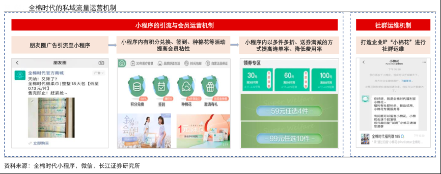 經(jīng)典案例:根據(jù)全棉時(shí)代小程序、微信、長(zhǎng)江證券研究所等綜合資訊表明,2020年全棉時(shí)代在自有平臺(tái)官網(wǎng)、小程序和APP 端實(shí)現(xiàn)銷(xiāo)售4.05億元,同增425.56%,在線上收入的占比同比提升 12.7pct 至 17.3%。其中門(mén)店引流到小程序?qū)崿F(xiàn)的銷(xiāo)售為 2.05 億元,占線上收入的 8.8%。