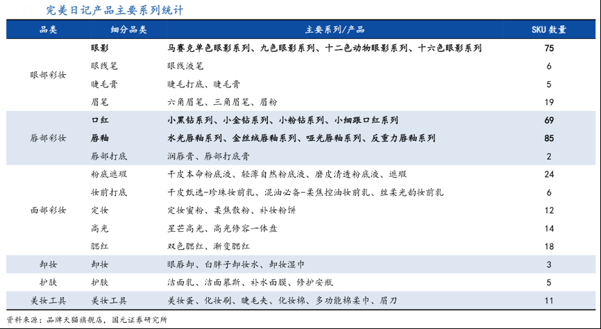 經(jīng)典案例:根據(jù)品牌天貓旗艦店、國(guó)元證券研究所等綜合資訊表明,截至 2020 年 9 月末,完美日記共有 SKU 1363 個(gè),顯著多于傳統(tǒng)彩妝品牌。另外其從形成產(chǎn)品概念到產(chǎn)品上線時(shí)間可控制在 6 個(gè)月之內(nèi),在 2019 年、2020Q1-Q3 期間分別推出新 SKU 超過(guò) 800 個(gè)與 700 個(gè),更新迭代速度業(yè)內(nèi)領(lǐng)先。產(chǎn)品分布方面,根據(jù)對(duì)完美日記天貓旗艦店產(chǎn)品的統(tǒng)計(jì),其擁有全系列彩妝產(chǎn)品,包括眼部、唇部、面部彩妝,以及卸妝、美妝工具等周邊產(chǎn)品,但多數(shù)SKU聚焦在色彩豐富度較高的眼部彩妝與唇部彩妝上。