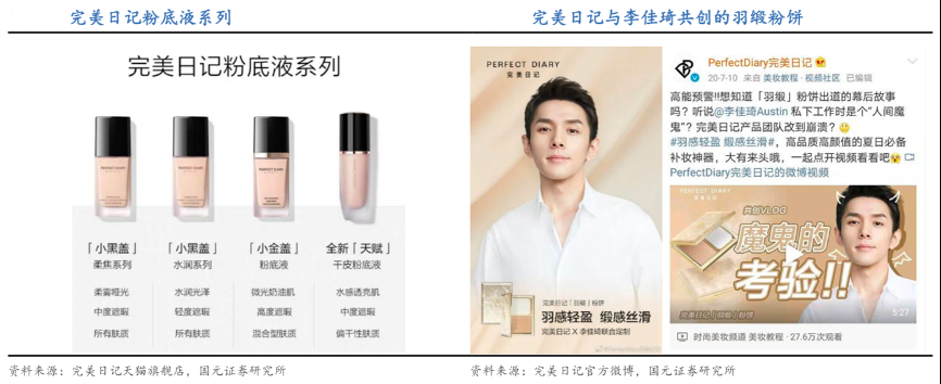 經(jīng)典案例:根據(jù)完美日記天貓旗艦店、完美日記官方微博、國(guó)元證券研究所等綜合資訊表明,完美日記自成立后陸續(xù)推出小黑蓋、小金蓋、天賦粉底液三款粉底,在定價(jià)上也逐漸升級(jí),從初期注重性價(jià)比的小黑蓋(定價(jià) 59.9 元),逐漸升級(jí)為主打膚感、效果的天賦粉底液(定價(jià) 129.9 元)。2020 年 7 月品牌攜手 超頭主播李佳琦推出共創(chuàng)底妝產(chǎn)品羽緞粉餅,并將產(chǎn)品開(kāi)發(fā)過(guò)程以視頻形式傳達(dá)給消費(fèi)者,借助專業(yè)美妝 KOL 的影響力與背書(shū),提升品牌底妝產(chǎn)品在消費(fèi)者心中的專業(yè)度。