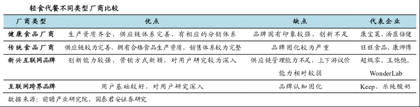 經(jīng)典案例:根據(jù)前瞻產(chǎn)業(yè)研究院、國泰君安證券研究等綜合資訊表明,從企業(yè)特征來看,代餐食品市場以四類廠商為主,包括康寶萊等健康食品廠商,旺旺、康師傅等傳統(tǒng)食品廠商,超級零、王飽飽等新興互聯(lián)網(wǎng)品牌,以及Keep、樂純等互聯(lián)網(wǎng)跨界品牌。其中,健康食品廠商與傳統(tǒng)食品廠商在生產(chǎn)加 工、線下渠道、供應鏈管理等方面具有傳統(tǒng)優(yōu)勢;而新興互聯(lián)網(wǎng)品牌與跨界品牌則更擅長產(chǎn)品創(chuàng)新,在新營銷、新渠道方面更加迎合年輕用戶。