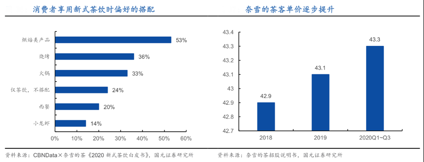 經(jīng)典案例:根據(jù)《2020 新式茶飲白皮書》、國元證券研究所等綜合資訊明明,據(jù),53%的消費者表示在享用新式茶飲時偏好搭配烘焙類產(chǎn)品,燒烤、火鍋與新式茶飲搭配也受到消費者的青睞。奈雪推出軟歐包、甜品小食等交叉銷售產(chǎn)品,經(jīng)典烘焙產(chǎn)品超 25 款,豐富產(chǎn)品 SKU 的同時提升客單價。2020 年奈雪的茶平均客單價為 43 元,排名高端現(xiàn)制茶飲首位 (行業(yè)均值約為 35 元)。