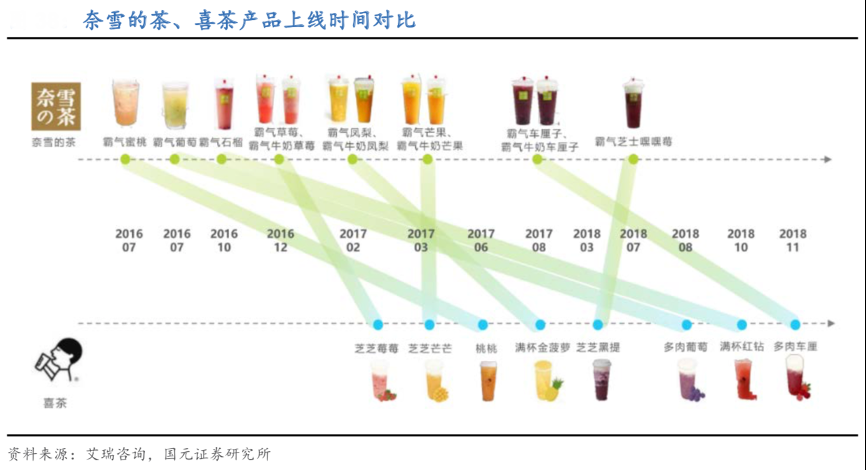 經(jīng)典案例:根據(jù)艾瑞咨詢、國元證券研究所等綜合資訊明明,新品周期上,奈雪平均 1 周推出一款新品,喜茶平均 1.2 周推出一款新品。喜茶和奈雪的茶推出的新品種類有所重疊,上線新品多與應(yīng)季鮮果有關(guān),大體上奈雪的茶相 比喜茶稍早推出類似新品。推新周期短維持品牌的高曝光度,保障對于消費者的持續(xù) 吸引力,從而提升回購率和消費頻次。