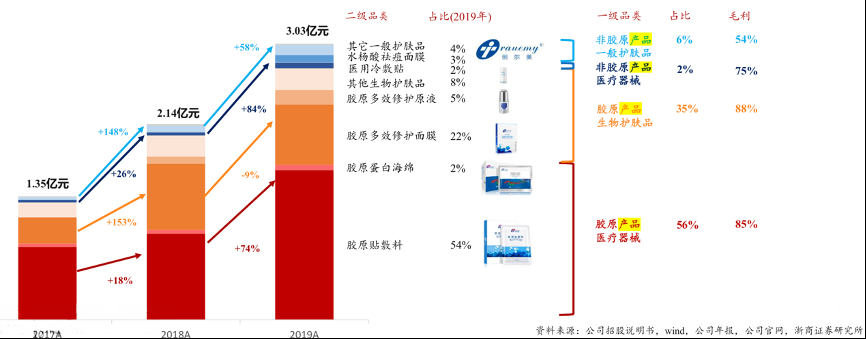 經(jīng)典案例:根據(jù)公司招股說(shuō)明書(shū)、wind、公司官網(wǎng)、公司年報(bào)、浙商證券研究所等綜合資訊表明,創(chuàng)爾生物以“創(chuàng)???rdquo;“創(chuàng)爾美”兩大品牌為核心,深耕于活性膠原及其終端產(chǎn)品的研發(fā)、生產(chǎn)、銷(xiāo)售,已成為國(guó)內(nèi)生物醫(yī)用活性膠原材料細(xì)分領(lǐng)域的領(lǐng)先企業(yè)。其產(chǎn)品以活性膠原為核心,拓展終端應(yīng)用。按產(chǎn)品成分是否含有膠原可分為膠原產(chǎn)品(20年收入占比85.5%)和非膠原產(chǎn) 品(20年收入占比14.3%)兩大類(lèi),其中膠原產(chǎn)品包括醫(yī)療器械和生物護(hù)膚品,非膠原產(chǎn)品主要包括醫(yī)療器械和一般護(hù)膚品。