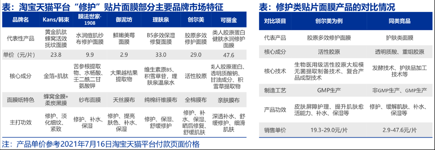 經(jīng)典案例:根據(jù)標(biāo)點(diǎn)醫(yī)藥、品牌天貓旗艦店、創(chuàng)爾生物招股書、申萬宏源研究等綜合資訊表明,膠原蛋白各個(gè)品牌的差別主要在于核心成份和面膜,活性膠原成分以修復(fù)等功效實(shí)現(xiàn)差異化競(jìng)爭(zhēng)。膠原生廠商產(chǎn)品矩陣擴(kuò)張:創(chuàng)爾生物等在醫(yī)療器械產(chǎn)品的基礎(chǔ)上,同步開發(fā)妝字號(hào)產(chǎn)品,添加更多成分,以達(dá)到修復(fù)之外的更多護(hù)膚功效。