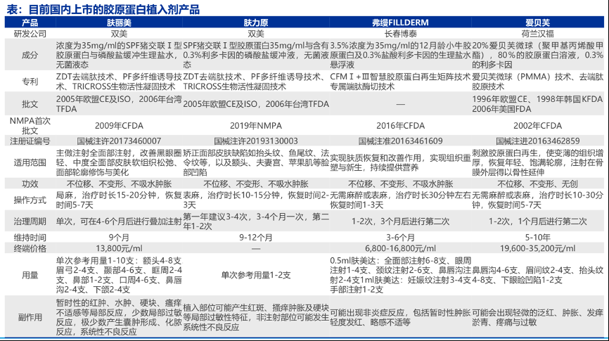 經(jīng)典案例:根據(jù)國(guó)家藥監(jiān)局、各公司官網(wǎng)、新氧、申萬宏源研究等綜合資訊表明,相比玻尿酸在國(guó)內(nèi)已獲批40多款產(chǎn)品,目前國(guó)內(nèi)上市的膠原蛋白注射填充劑的III類器械僅有3家公司:雙美、長(zhǎng)春博泰、荷蘭漢福。