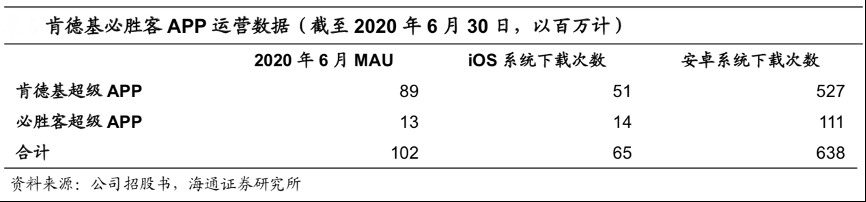經(jīng)典案例:根據(jù)公司招股書、海通證券研究所等綜合資訊表明,肯德基與必勝客分別于 2015 年、2017 年推出各自超級 APP,根據(jù)公司招股書援引沙利文報告,二者分別為中國首家推出超級 APP 的快餐品牌和休閑餐飲品牌。截至 2019 年底,肯德基及必勝客的超級 APP 是中國餐飲業(yè)下載次數(shù)最多的應(yīng)用程 序,iOS及安卓系統(tǒng)下載升級的次數(shù)約為第二名規(guī)模的三倍;并在同行內(nèi)擁有最高的月活躍用戶數(shù),約為排名第二的競爭對手規(guī)模的三倍。