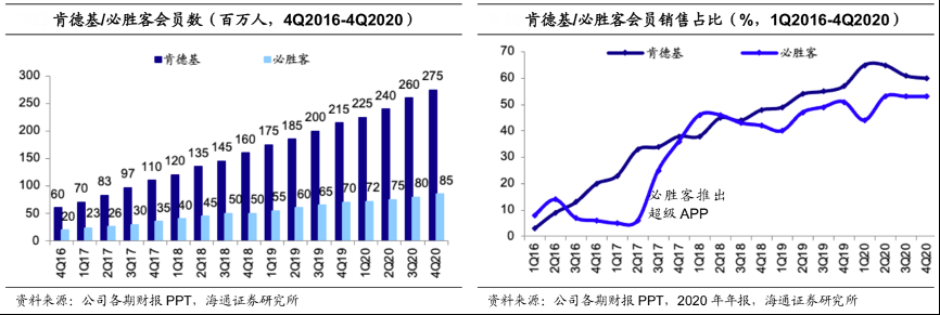 經(jīng)典案例:根據(jù)公司各期財報PPT、2020年年報、海通證券研究所等綜合資訊表明,截至 2020 年 12 月 31 日,肯德基及必勝客會員計劃分別有逾 2.75 億會員及逾 0.85 億會員。2020 年,肯德基會員銷售占比 62%,必勝客會員銷售占比 52%。重度會員往往會為公司貢獻(xiàn)額外收入,與 2016 年相比,2019 年每個活躍會員平均收入幾乎翻了一倍。此外,龐大的會員基數(shù)提供大量寶貴的顧客行為數(shù)據(jù),為其公司菜單創(chuàng)新和個性化增長服務(wù)提供信息。