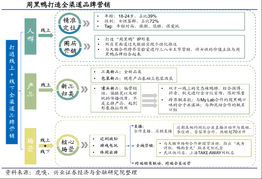 經(jīng)典案例:根據(jù)虎嗅、興業(yè)證券經(jīng)濟(jì)與金融研究院等綜合資訊表明,周黑鴨很早就緊跟直播的潮流做深度運(yùn)營(yíng),分為店內(nèi)直播、店外直播和內(nèi)容運(yùn)營(yíng),店外直播是公司跟 KOL、機(jī)構(gòu)合作,由他們協(xié)助帶貨,2020 年“相約湖北”公益直播活動(dòng)中與薇婭、李佳琦、雪梨等合作,產(chǎn)品總銷量破 70 萬(wàn)件,總銷售額超 1100 萬(wàn),位居鹵味零食類目第一。