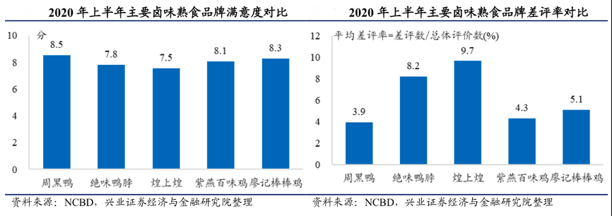 經(jīng)典案例:根據(jù)NCBD(餐寶典)、興業(yè)證券經(jīng)濟(jì)與金融研究院等綜合資訊表明,結(jié)合NCBD(餐寶典)大數(shù)據(jù)檢測(cè)、自有餐飲數(shù)據(jù)檢測(cè)系統(tǒng)發(fā)布的《2020中國(guó)鹵味熟食差評(píng)大數(shù)據(jù)分析與研究報(bào)告》顯示,在中國(guó)主要鹵味品牌周黑鴨、絕味鴨脖、煌上煌、紫燕百味雞、廖記棒棒雞中,周黑鴨的整體滿意度最高。