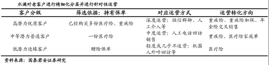 經(jīng)典案例:根據(jù)國泰君安證券研究等綜合資訊表明,水滴基于對于客戶的理解,將客戶信息標(biāo)簽化后,對客戶質(zhì)量進(jìn)行有效評估,采取不同的方式將客戶分層進(jìn)行精細(xì)化運(yùn)營。